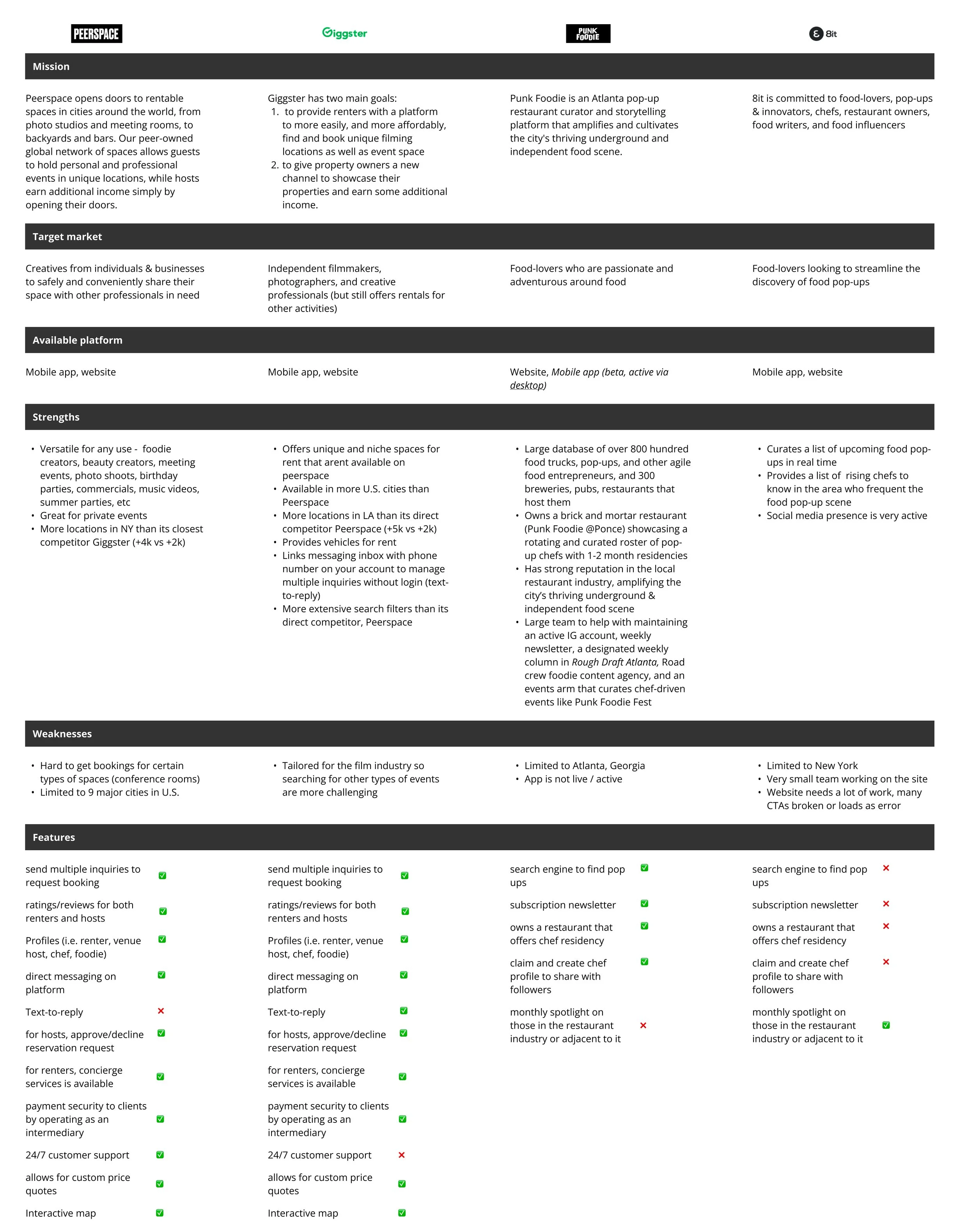 Peerspace and Giggster are 2 indirect competitors that offer similar services, but not specific to the pop-up scene. These platforms also share similarities with Airbnb’s design patterns.