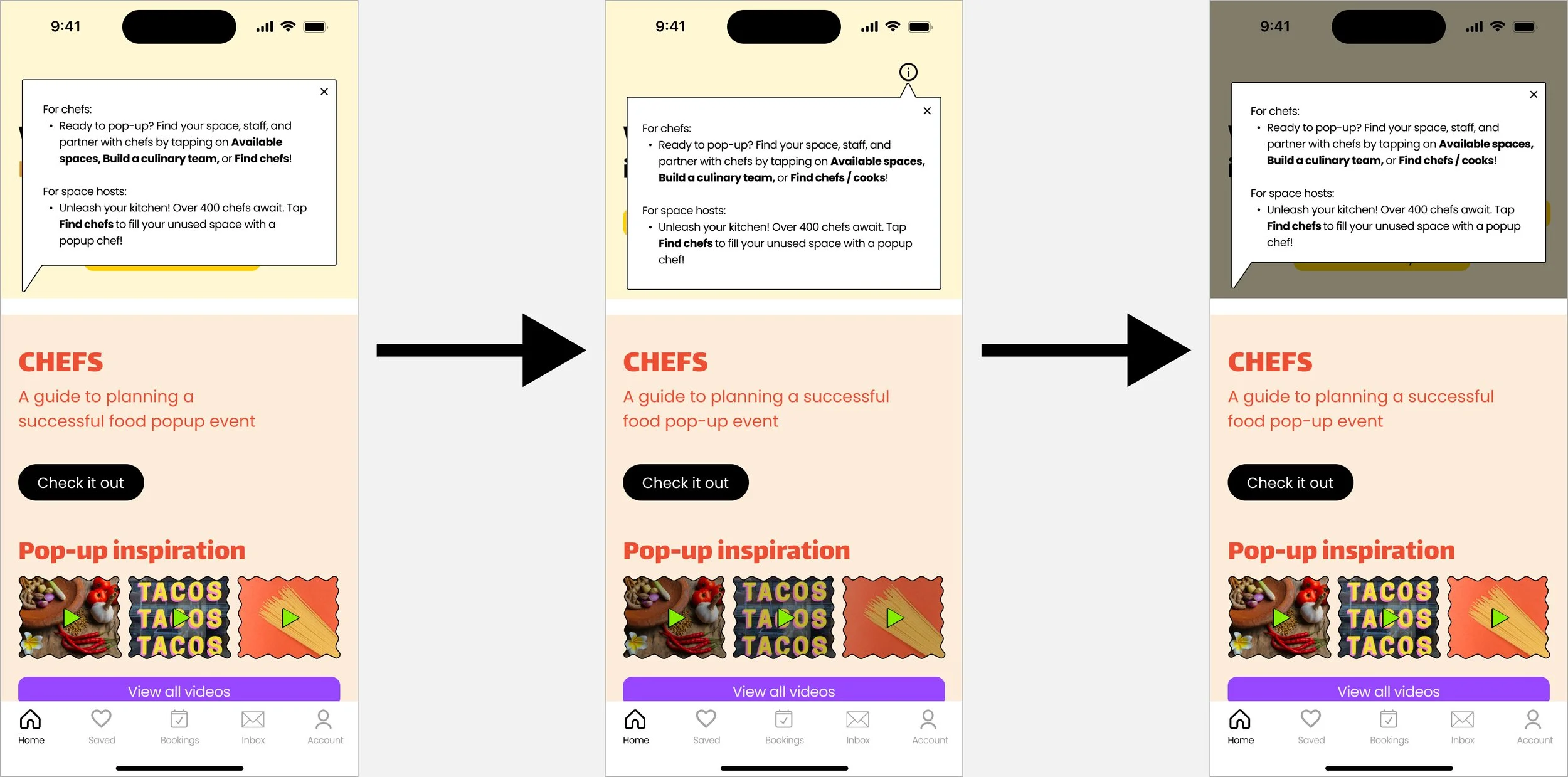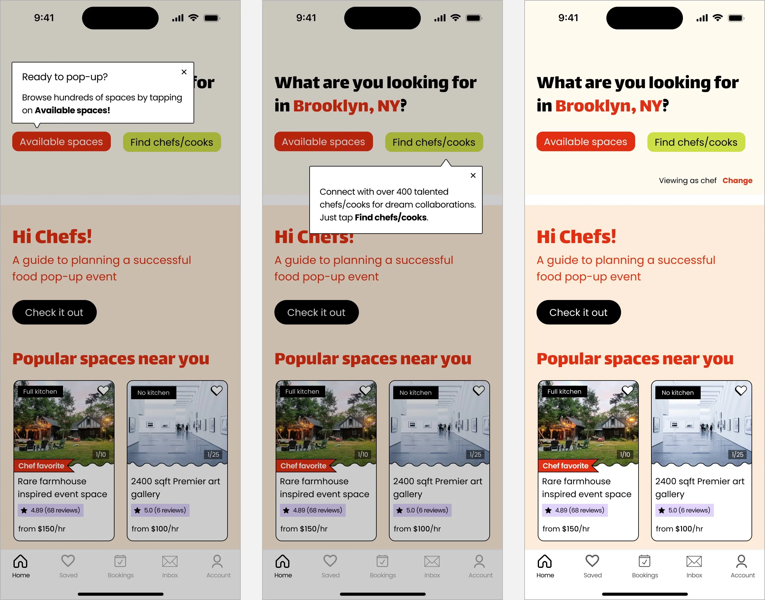 For the final revision, I split up the tooltip text into 2 distinct sections, each tooltip guiding users to the appropriate CTAs. The "Viewing as chef Change" serves as a toggle, enabling users to seamlessly switch between chef and host-specific content.