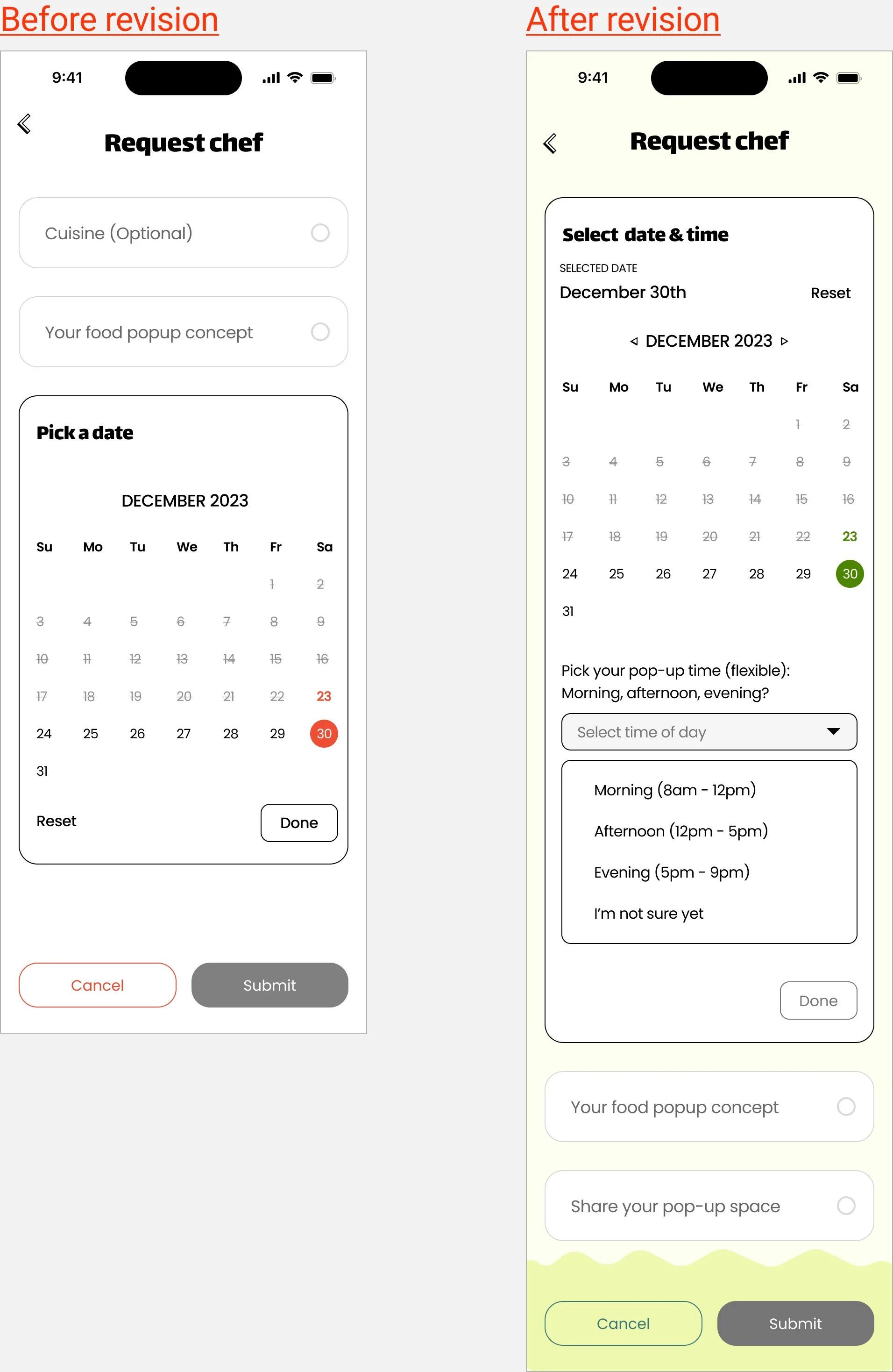 Added ‘View chef’s schedule’ CTA: This allows users to quickly access a collaborator’s schedule before initiating a request. From testing, participants had a strong preference for a streamlined date/time selection process.
