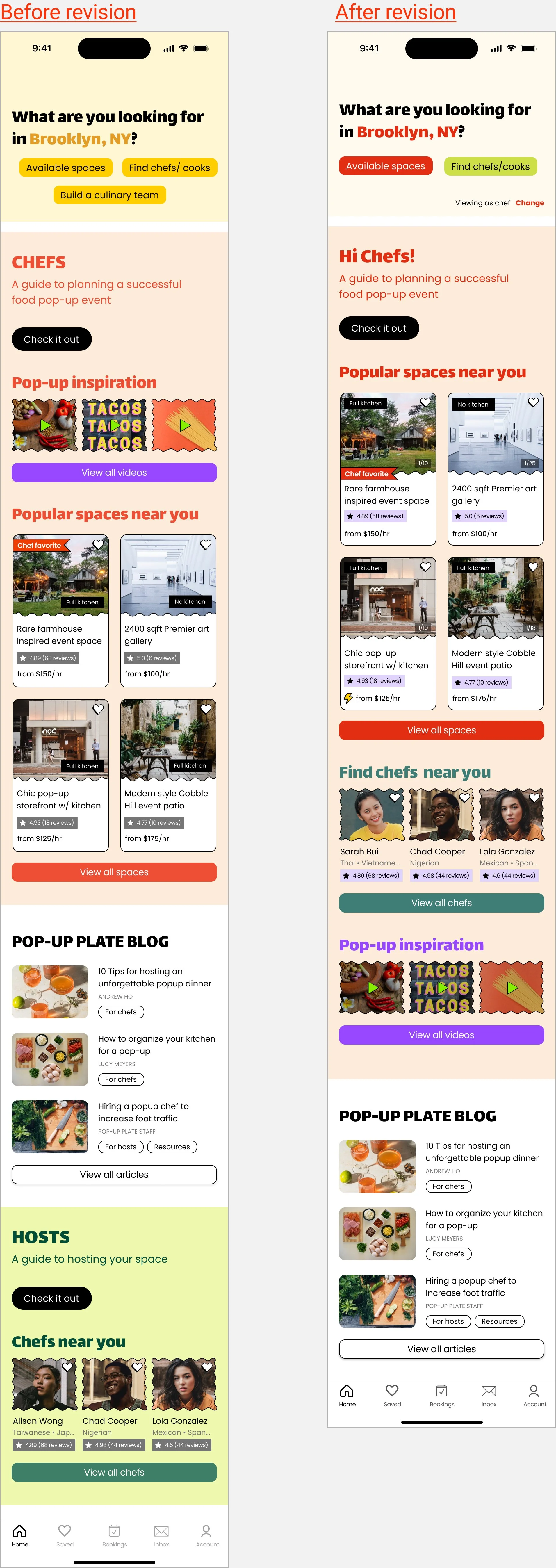 For this project, my primary user group is chefs. I removed the sections designated for hosts to minimize distractions and simplify the interface. As a reminder, the landing page dynamically adjusts its content based on the audience selected on the modal (from Update #1), ensuring a personalized user experience.