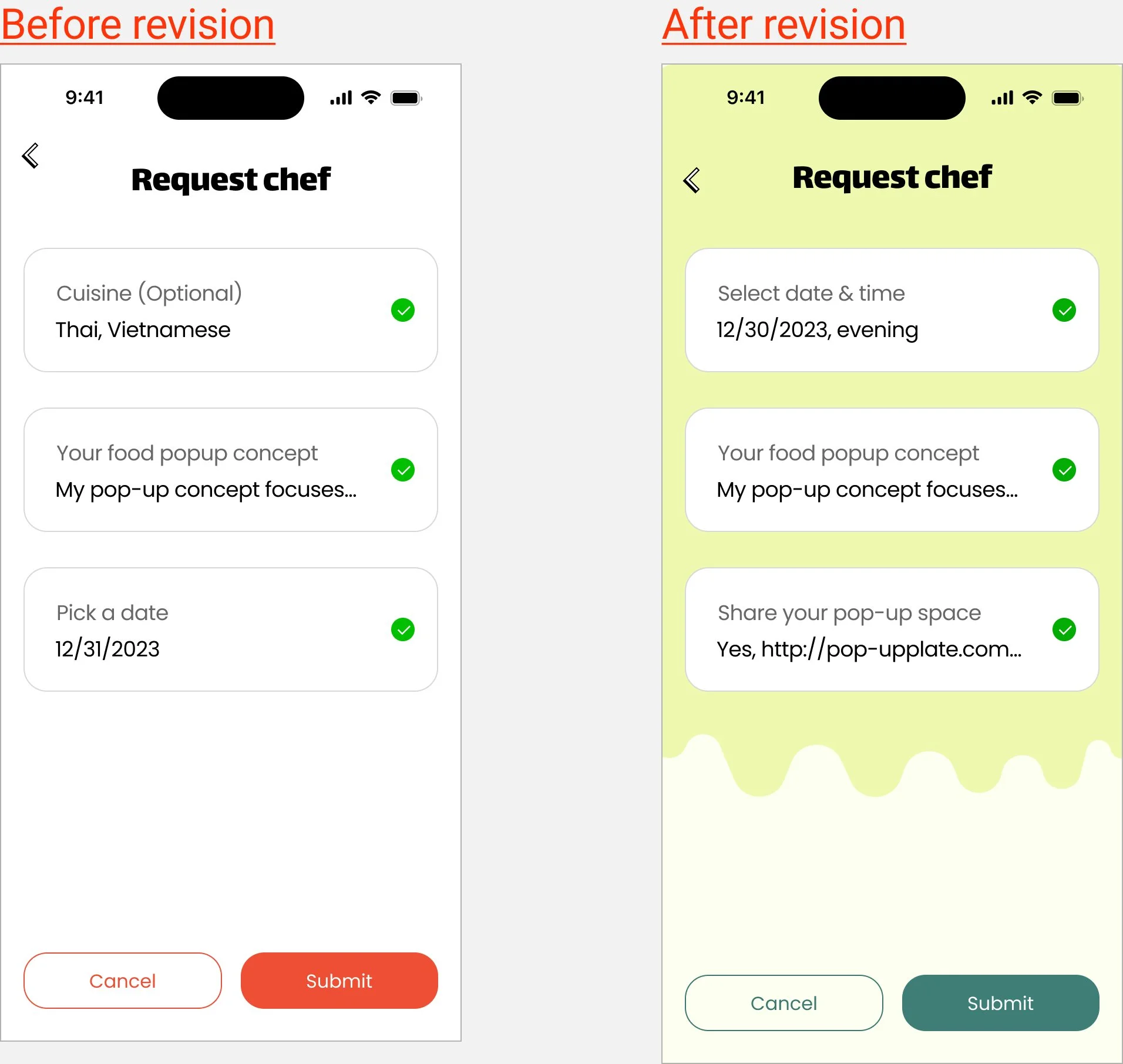 Enhance look and feel of the request chef flow: Participants mentioned that this flow lost its playfulness. For a cohesive experience, I added green waves in the background to amplify the feeling of playfulness. I replaced the accents of red with green to visually differentiate the 2 features.
