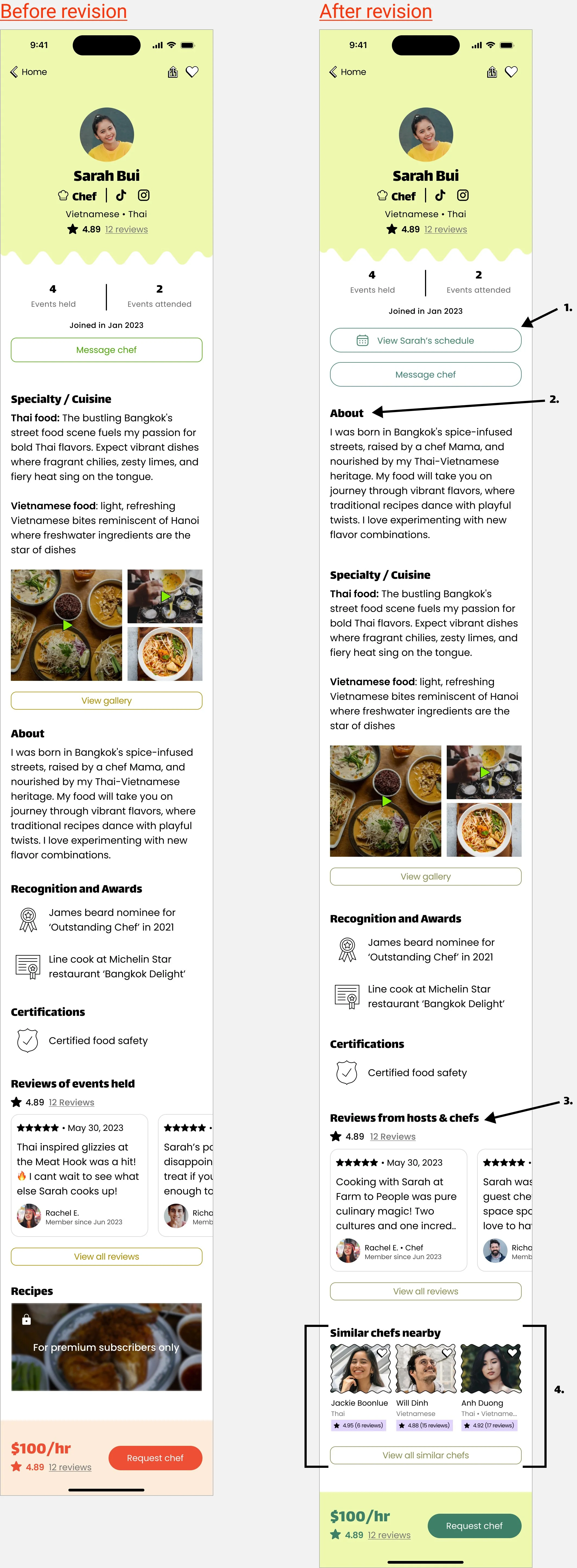 Replaced ‘Recipes’ with ‘Similar chefs nearby’: The recipe section did not add value to the user and was replaced with “Similar chefs nearby.” This change facilitates the discovery of other chefs that share similar specialties, streamlining the search process for discovering chefs.